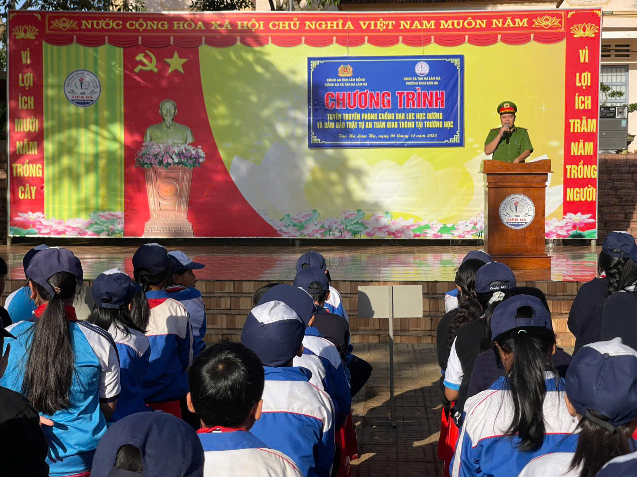Sáng ngày 08/12/2025, Trường THCS Liên Hà phối hợp với lực lượng Công an xã Tân Hà Lâm Hà, tỉnh Lâm Đồng tổ chức chương trình ngoại khóa “Tuyên truyền phòng chống bạo lực học đường và đảm bảo trật tự an toàn giao thông tại trường học” cho toàn thể học sinh.